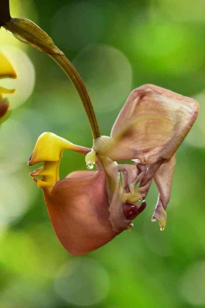 ☞受粉方法は特殊で、匂いで蜂を誘い、水滴をためた「バケツ」に落ちるのを待つ。「バケツ」に落ちた蜂が、花弁のスキ間から出る時に、出口をふさいでいる花粉が体に付いて別の花に運ぶ。