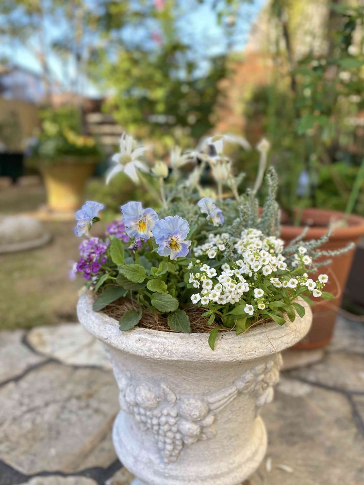 フランネルフラワーは夏越ししたのですか?こちらは まだ出回ってないです。アリッサムは寄せ植えに重宝しますね✨