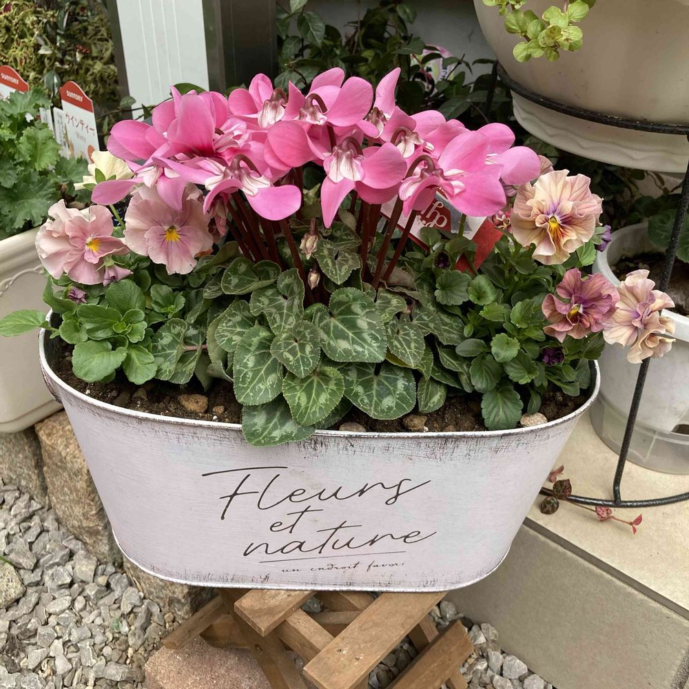 薄いピンクのブリキ鉢にピンクのお花で超ピンク🩷