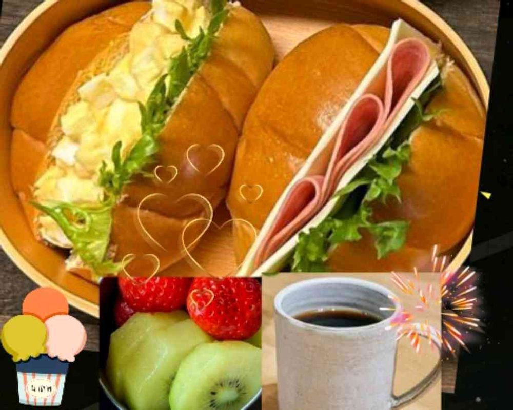 タマゴ&ハムとチーズを挟んだロールパンですね🎵