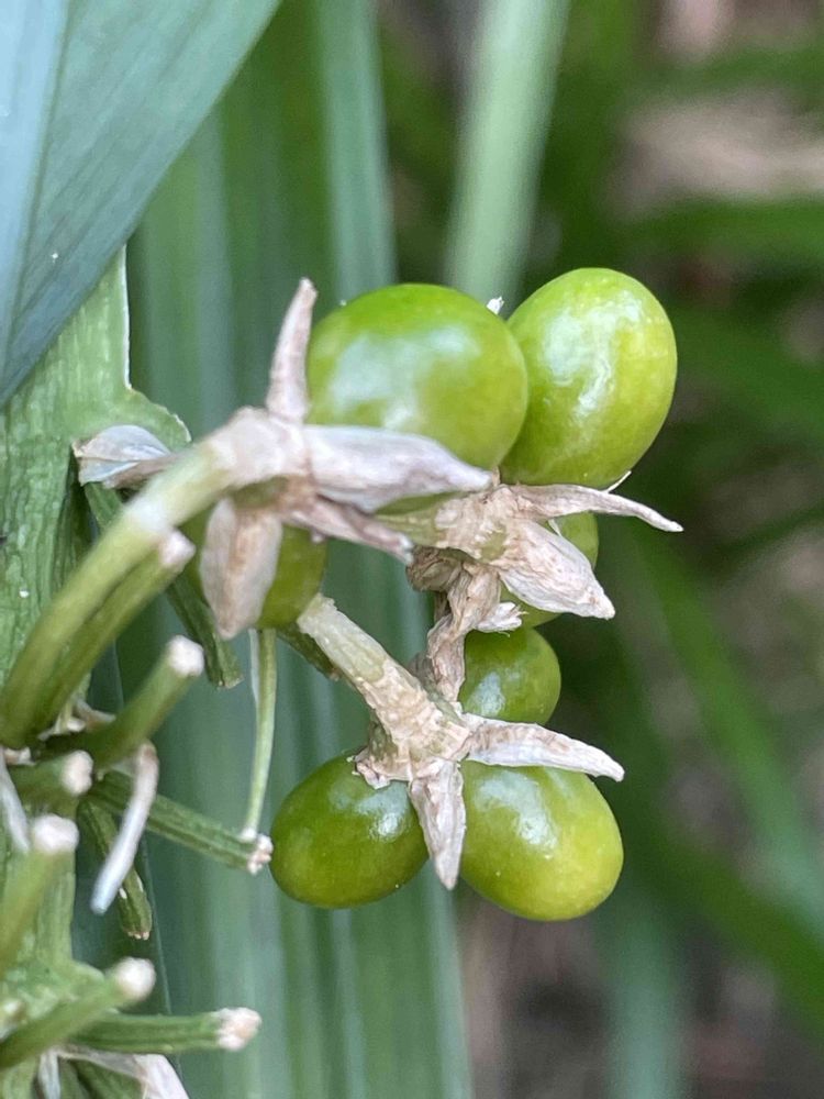 シランは グリーンのラグビーボールみたいな小さな楕円形 の様な実付きます
