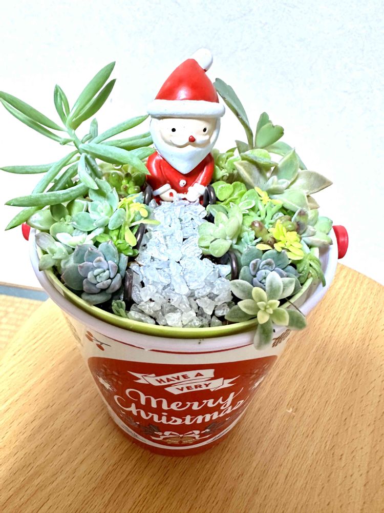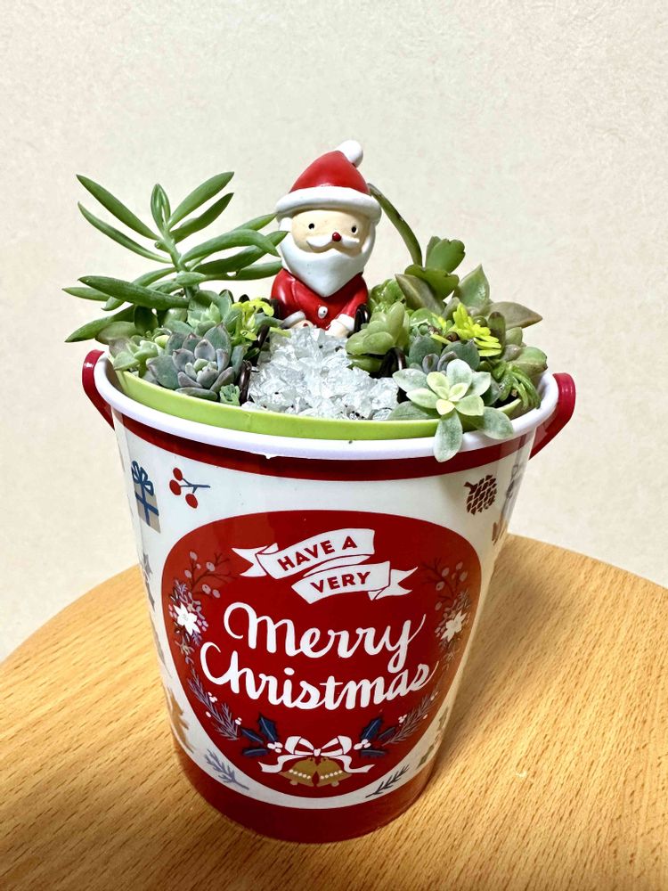 会社の玄関用の寄植え。クリスマスバージョン🎄ハロウィンバケツはピッタリ合ったけどクリスマスバケツは少し大きいかったか😱オアシスでかさ上げして、ふちの隙間は目をつぶってもらいます。