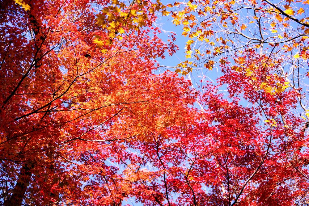 青空を紅葉で独り占めしているほどに艶やかなモミジです