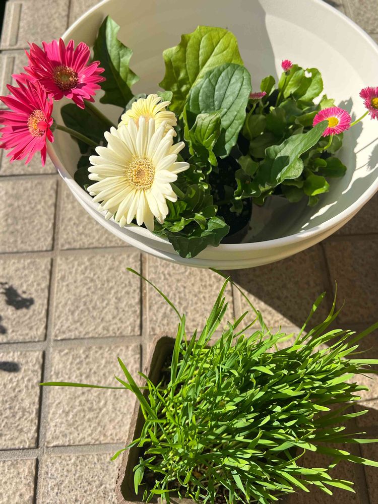 3枚目 ホームセンターのリニューアルオープンで特売ではなかったですが、ガーベラとデージー、ネコ草を買いました🌸🌱