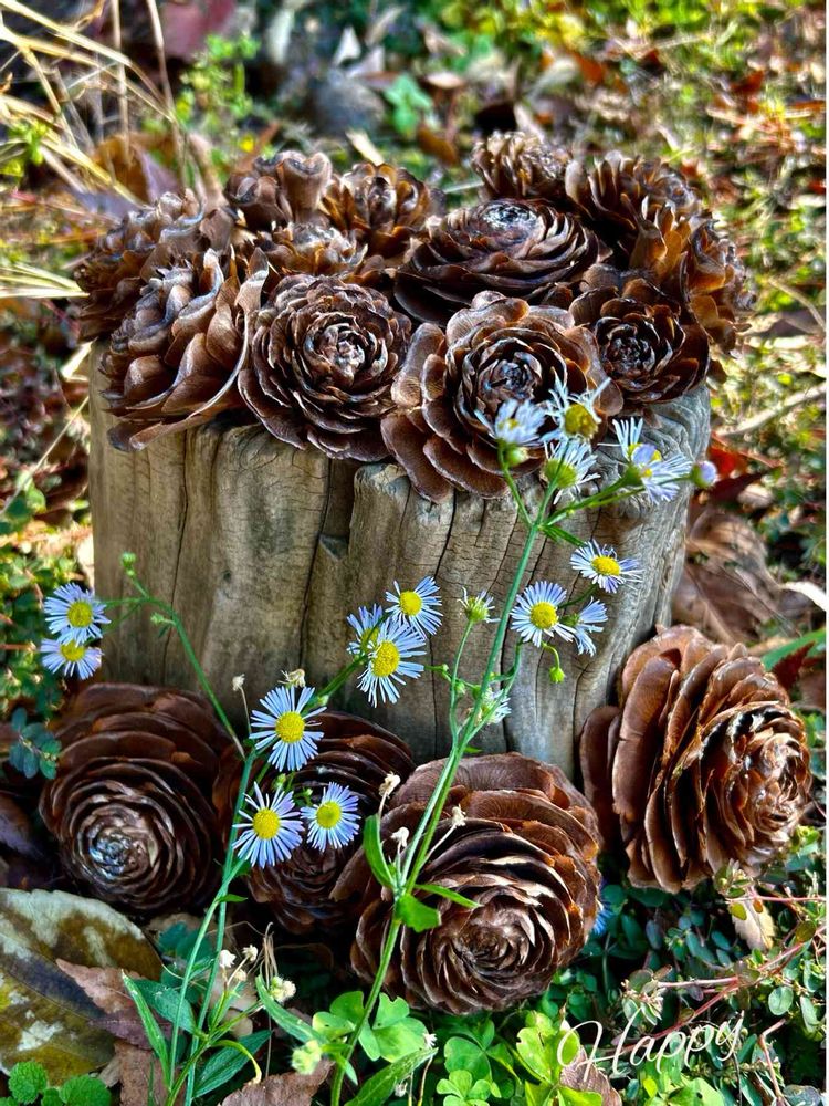 先日拾った同じ場所🌲公園のヒマラヤスギの下です♡また見落とされちゃったかもね😅そぉ思いながら拾い上げて切り株に飾って自然体バックに記念撮影💕今日は誰かのお家に迎えられてるかな〜(*´꒳`*)