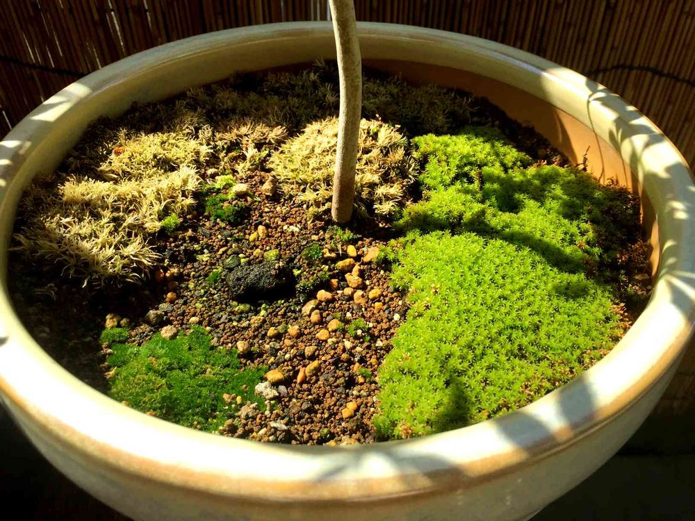 ドウダンツツジの根本に4種類の苔がカオスに生す。スナゴケ、アラハシラガゴケ、ハイゴケ、そして謎の苔…。