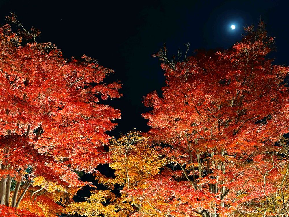 漆黒の闇の中でライトに照らされた色付いたモミジ🍁はとても妖艶な雰囲気です✨