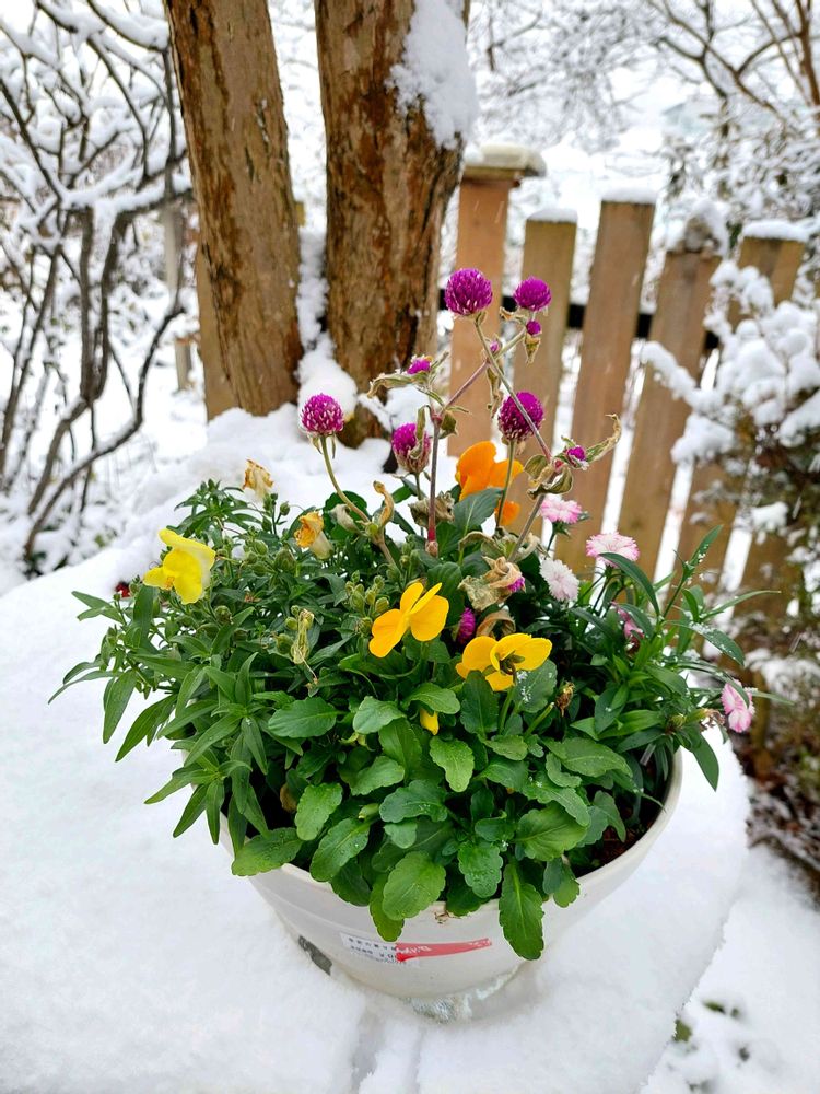 雪をかけて保温していたバラ鉢がむき出しになり寒風にさらされ心配です🥺