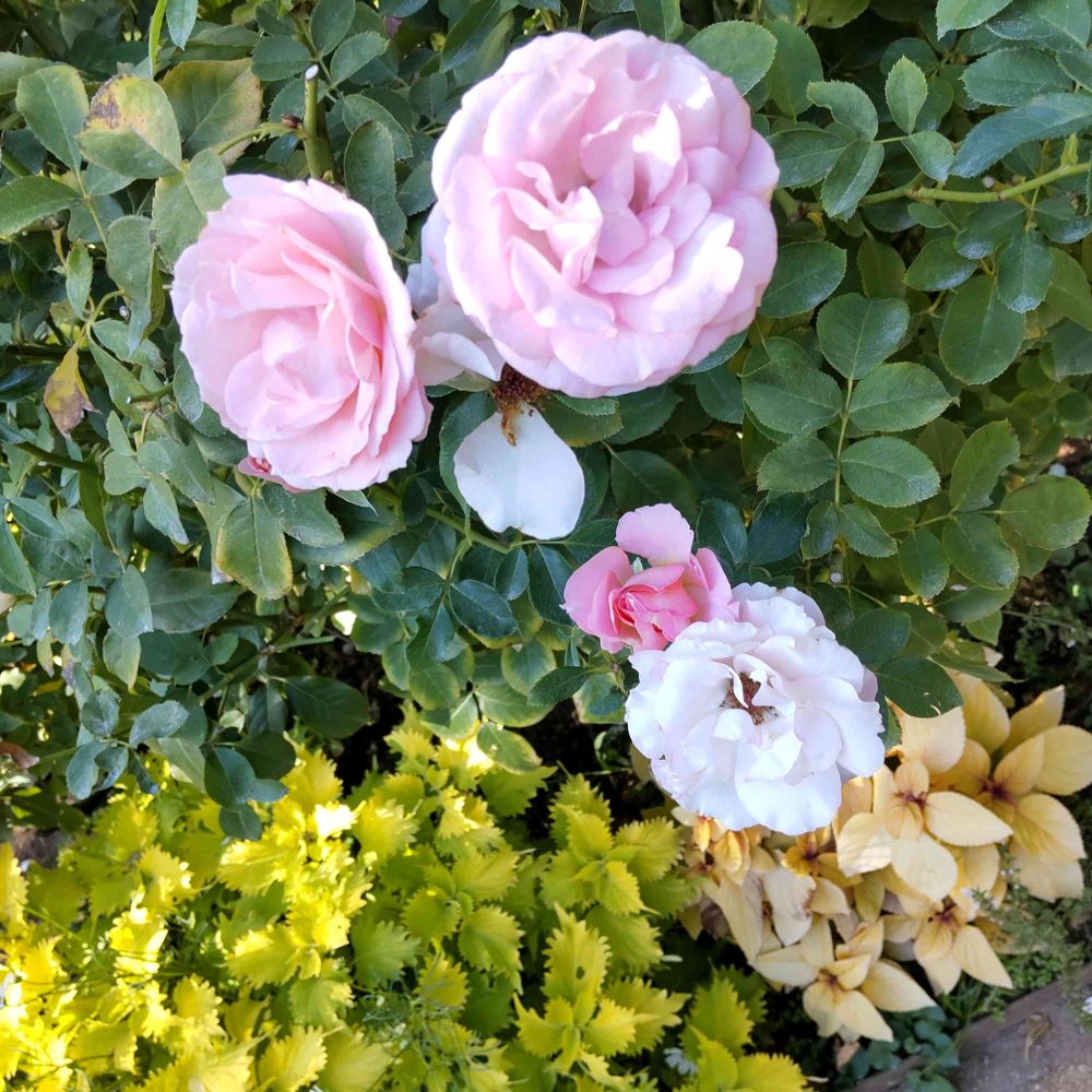 イングリッシュガーデンにて。ピンクのバラを引き立てているのはコリウス2種でしょうか。素敵な下草にもバラのように品種名の名札がほしくなってしまいます。