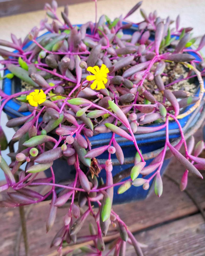 ルビーネックレスは長細い紫の色の葉が特徴で、寄せ植えにしてもかわいいと人気です。しかし育て方が難しく、水をあげすぎると葉の部分がぶよぶよになってしまうこともあります。葉の色が緑から紫に変わったりうまく育てることができれば花が咲くので、観賞用としても楽しめますよ。