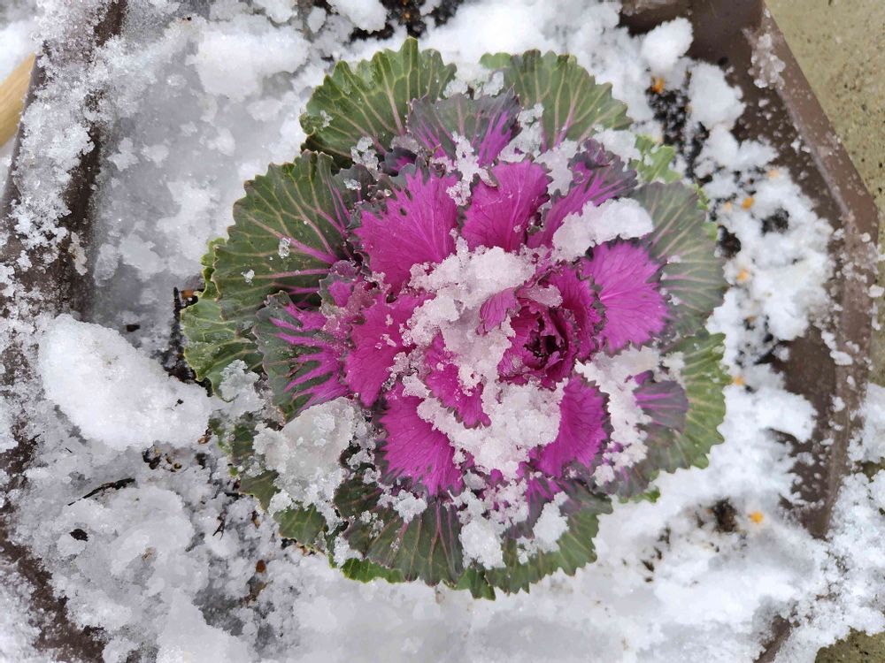 今日の朝の葉牡丹 雪が積もって寒そうでした