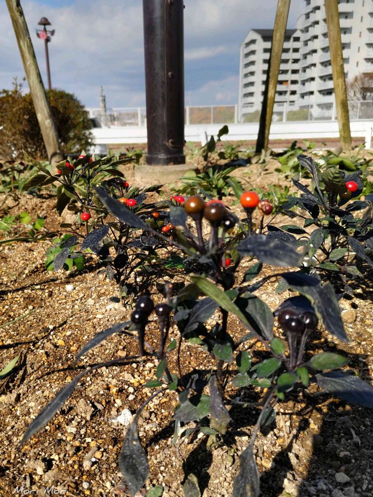 買い物先の花壇で、観賞用トウガラシ オニキスレッドでしょうか?