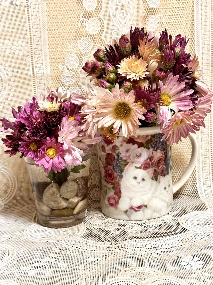 my gardenさんから頂いた菊のブーケをマグカップとガラス容器に飾りました(* 'ᵕ' )☆
