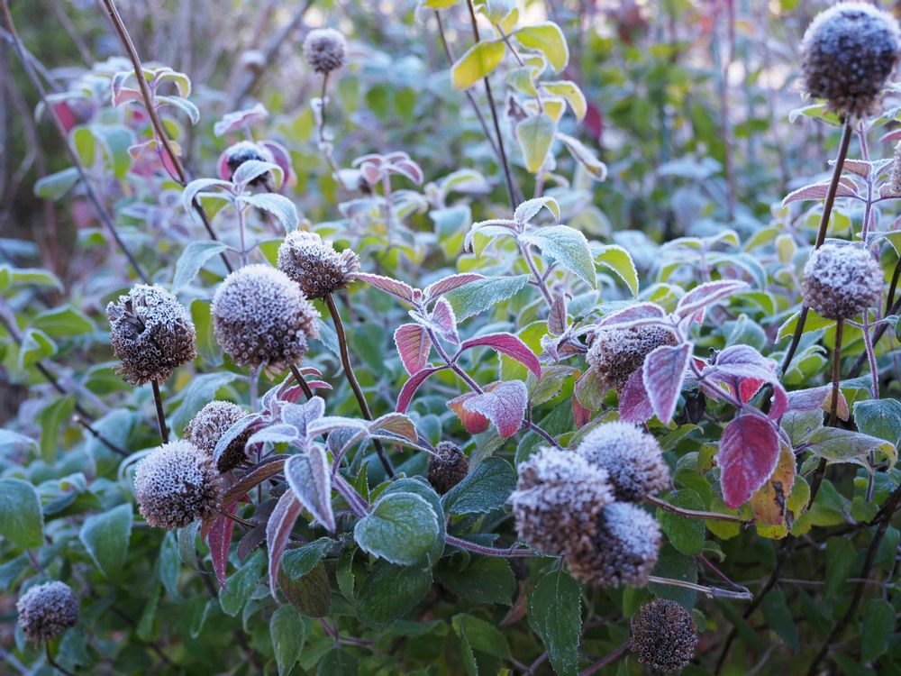 カット✂️してなかったモナルダの花柄と少しだけ紅葉🍁している葉っぱに霜が積もって綿帽子に😆