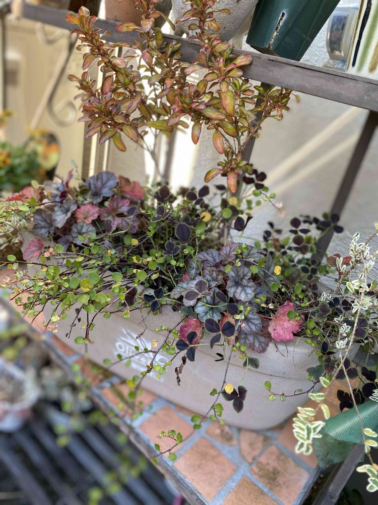 渋めのヒューケラとクローバーの組み合わせが素敵✨