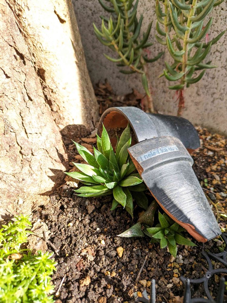 とりあえず割れた鉢の再利用を適当に置いて直射がガンガンは避けてみた
