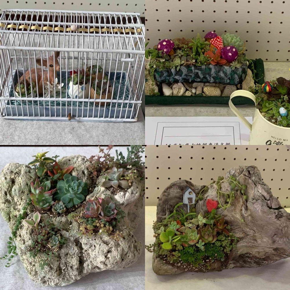 鳥かご、粘土で作った鉢、軽石で作った鉢、流木。