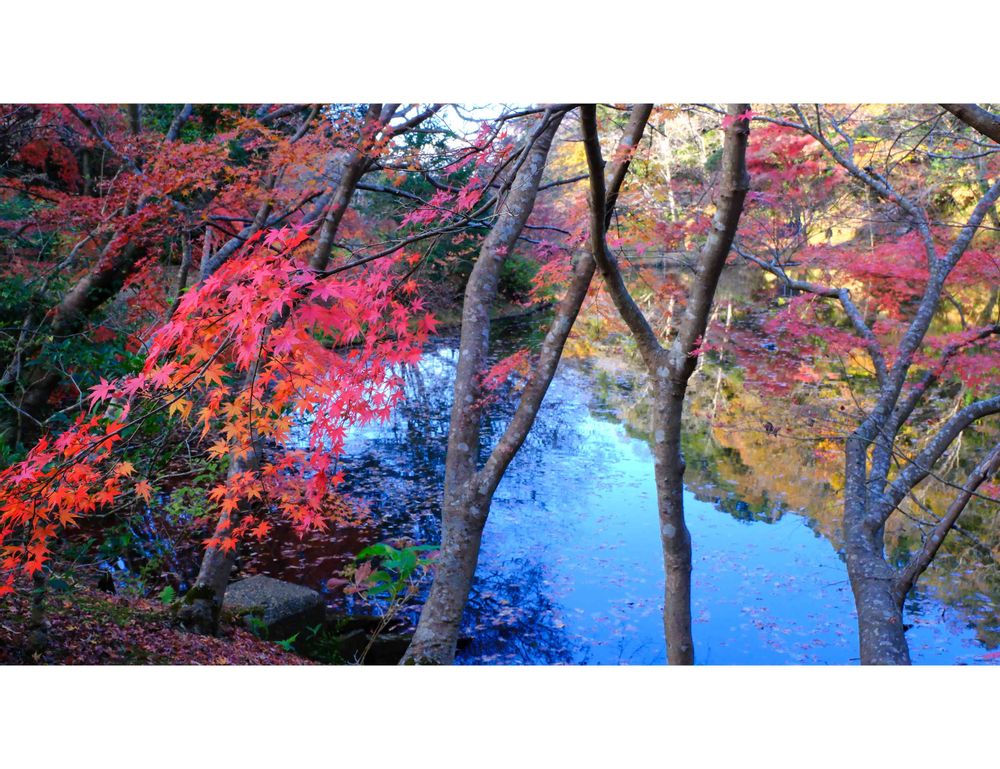 ここは紅葉が少なかったのですが、ちょうど池が見えるところだったので青い水面を広く取り入れてみました。