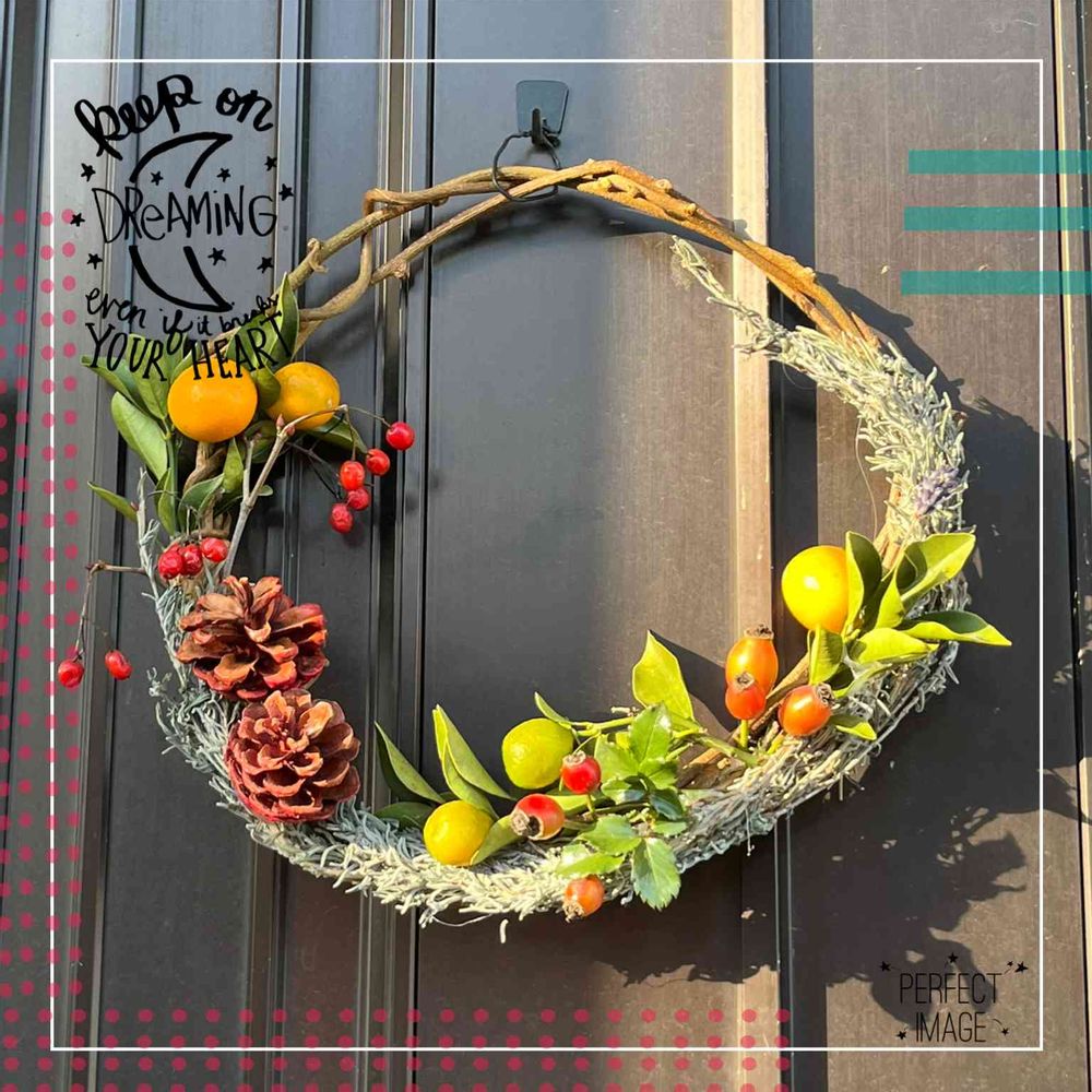 キユイフルーツの枝と、金柑の実、赤い実の枝をいただいて、家🏠にあるドライになったラベンダーの枝と🪻と松ぼっくりを飾ってリースを作ってみました🤗