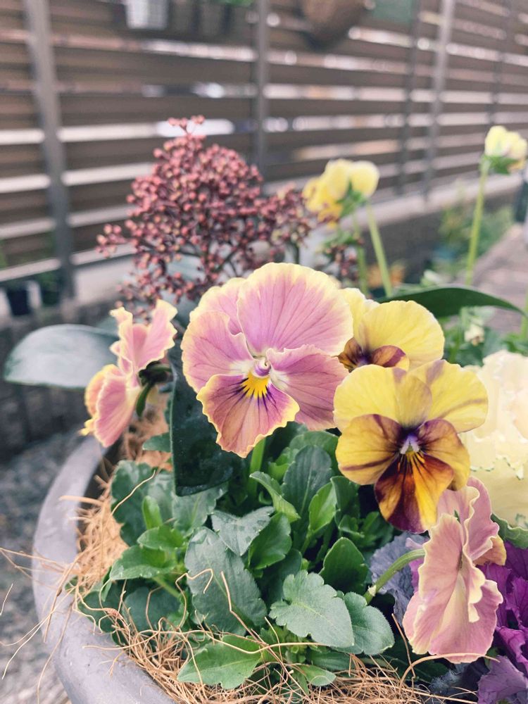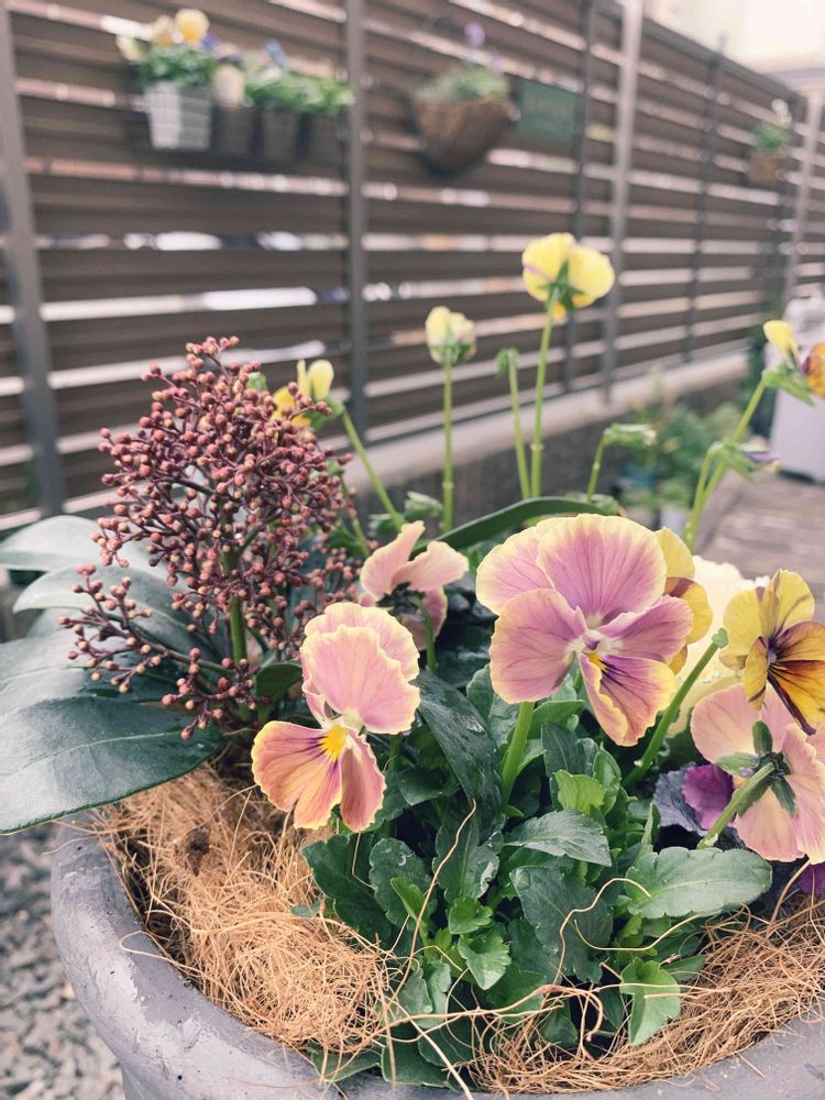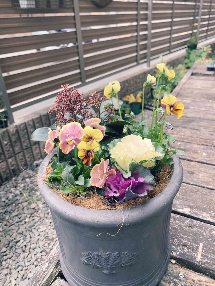 シックな鉢にスキミア、華やかなビオラとハボタンで大人かわいい寄せ植え✨