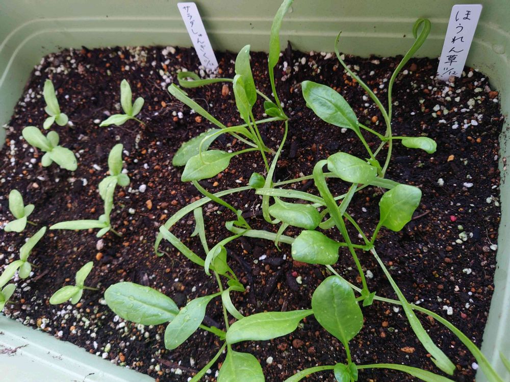 ダイソーで2個100円で買って11月初旬に種まきした「強健ほうれん草」と「サラダしゅんぎく」です🥬2回の間引きと1回の追肥でここまで育っています。保温ビニールの代わりにプランターに布団圧縮袋をかけています。冬の葉物は成長がゆっくりで大きさもある程度で収穫します。