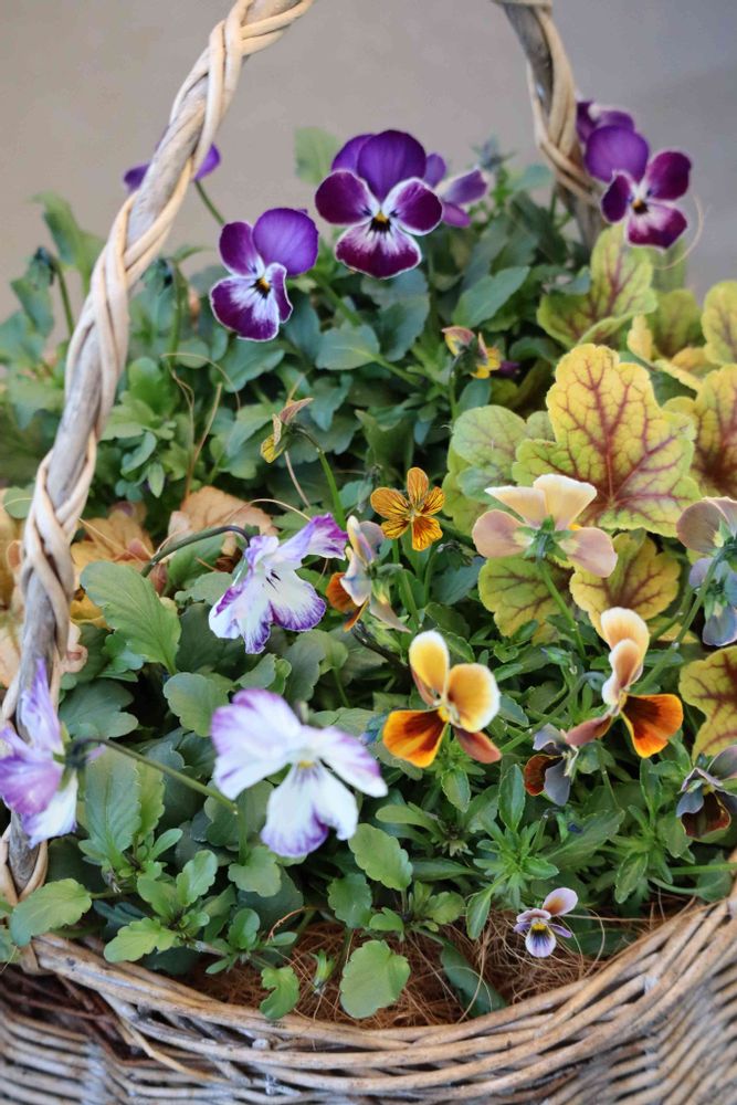集めていたビオラと夏越ししたヒューケラで寄植えバスケットつくりました♡ 黄〜茶〜紫の配色でシックな感じにしてみました。