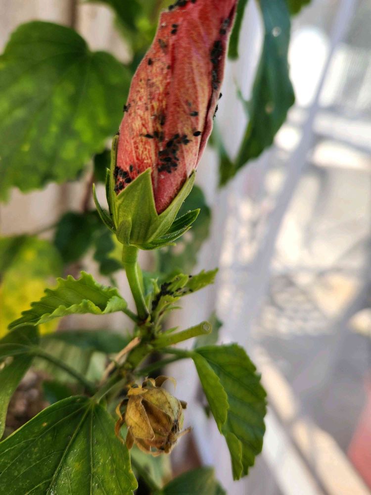 なんの虫か解らないのですが、動きもしません。他の花に移るのが嫌だったので、蕾のついた下の茎からチョキンしてしまいました。葉っぱにも付いていたので、そこもチョキン‼️
