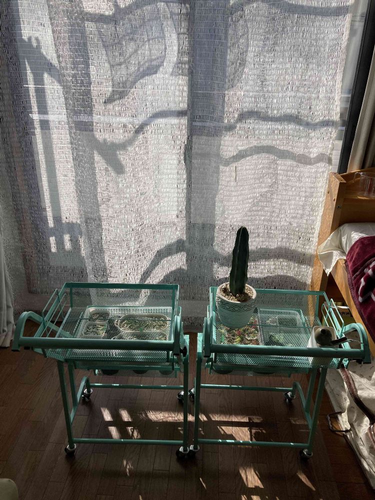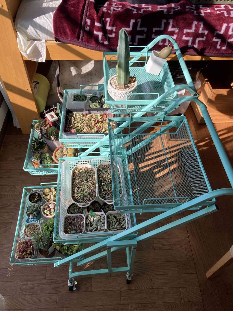 当初は、西向きの出窓に多肉を置くつもりでしたが、この季節はほとんど日が当たらないことがわかり、南向きの窓の前にワゴンを置くことにしました。