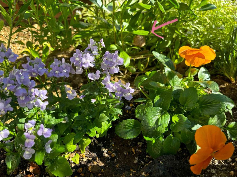 宿根ネメシアとパンジーの間の奥、オステオスペルマムの葉っぱにカマキリさんの卵が😳