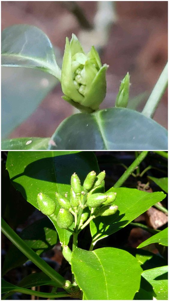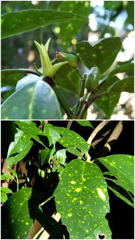 美しい斑入りの葉に色付き始めた実と葉芽が。斑無しの葉には斑入りの実と花芽⁉️