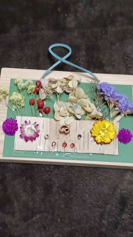 冬休み中の私ですが、園芸療法で作った白樺とドライフラワーの壁飾りが届いたので、紹介します。😃