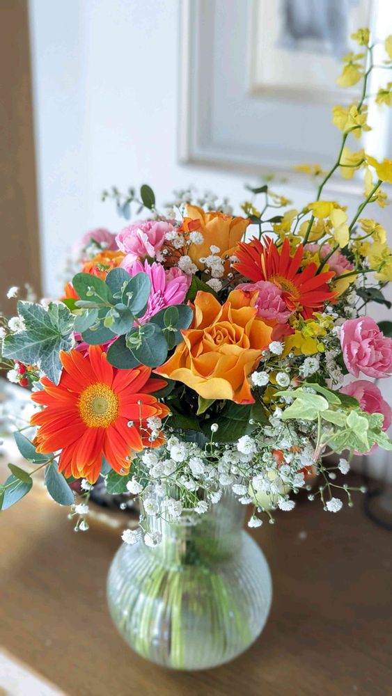 ほんとは赤だけで作りたいけど、スーパーのお花売り場に1個もなかったからあったやつ全部で😅