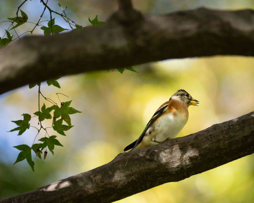 アトリさんがモミジのプロペラをモグモグしていました。背景はイチョウの紅葉。2022.11.22.撮影