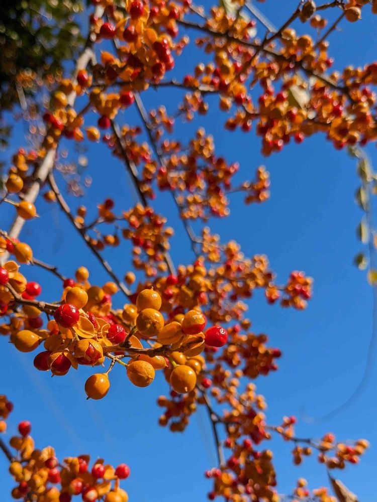 散歩道にて、ツルウメモドキの、実青空にさえてまーす、❤️❤️❤️❤️❤️❤️❤️🙋