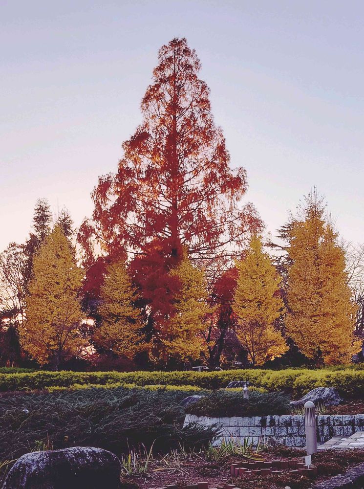 なんか絵になりそうです🤩 背のたかーいメタセコイアをイチョウたちが守っています😀(農業試験場内にて)