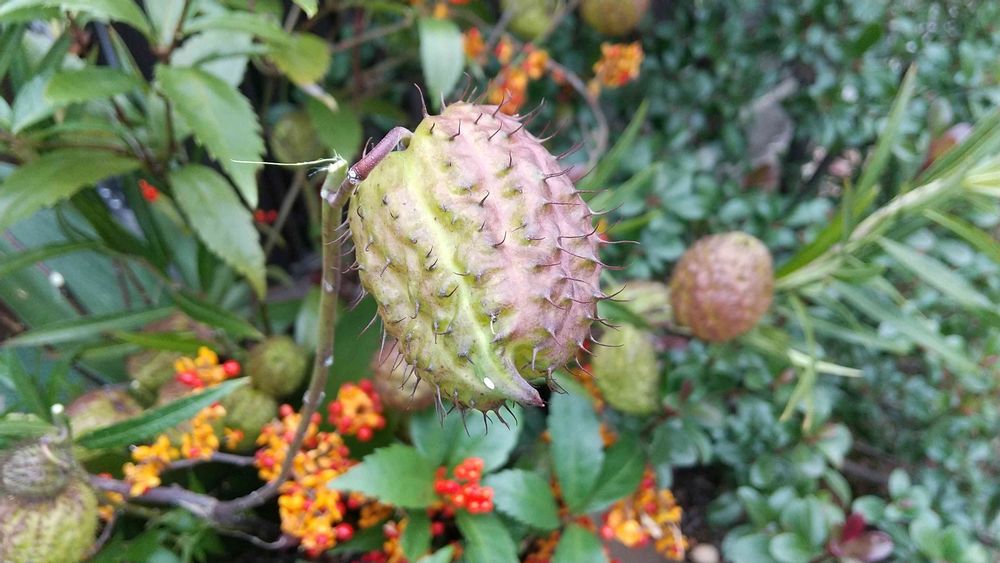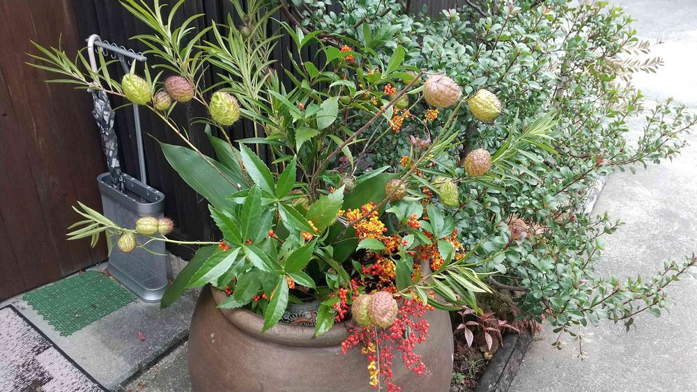 大きな瓶にフウセントウワタ、センリョウ、ウメモドキを飾っています。🤗