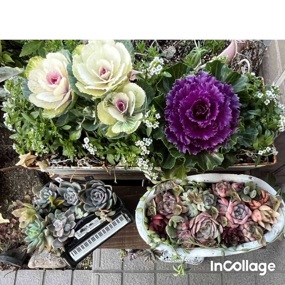 ④葉牡丹寄せ植えや多肉たちも綺麗になってきました。