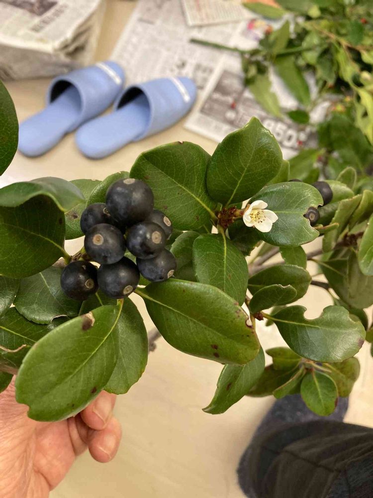 高さ20センチほどの低木で、花は5弁で白、8ミリほどです。実は黒で5から8個が密集しています。