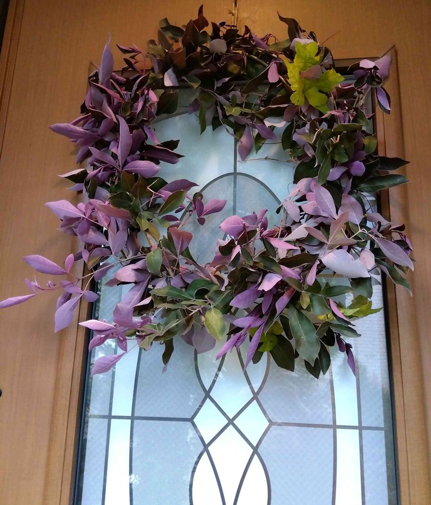 リーフだけで充分オシャレなリースですね💜💚うちは北風強すぎて玄関にリース飾ってもどこかへ飛んでいくの🤣
