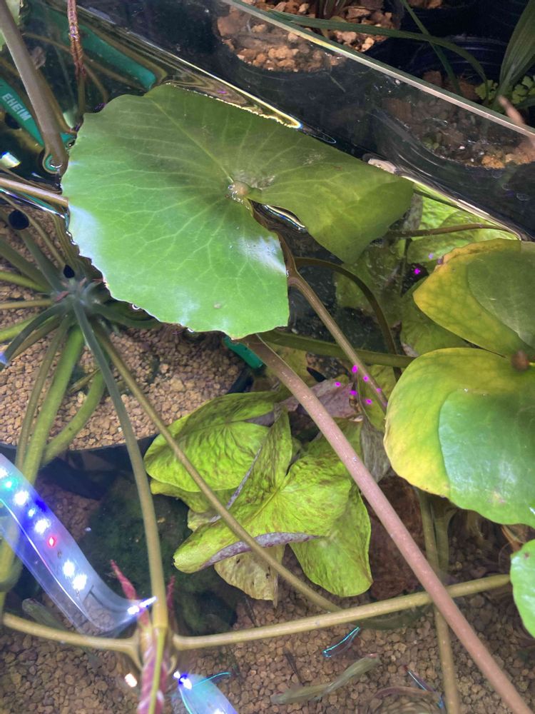 水槽睡蓮はまあまあ毎日咲いてますが、ここに来て寝てて良いのにモラーダベイ?が勢いよく成長を・・・