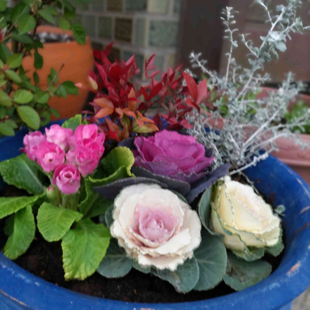 葉牡丹の寄せ植えもシルバーリーフが効いてますね!