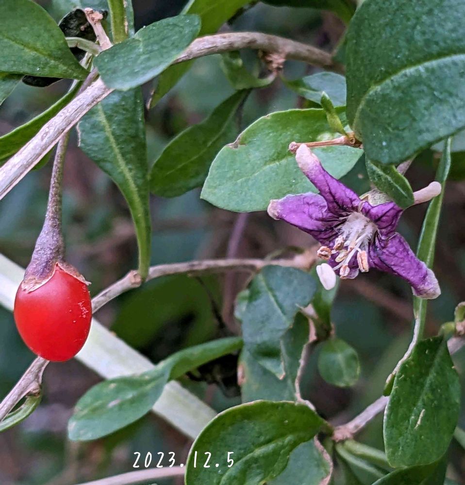 車道から少し奥に入った小道の藪~弓なりに垂れた小枝の葉の付け根から…ナスに似たお花と朱色の小さな実がついていました‥💜🔴🌿