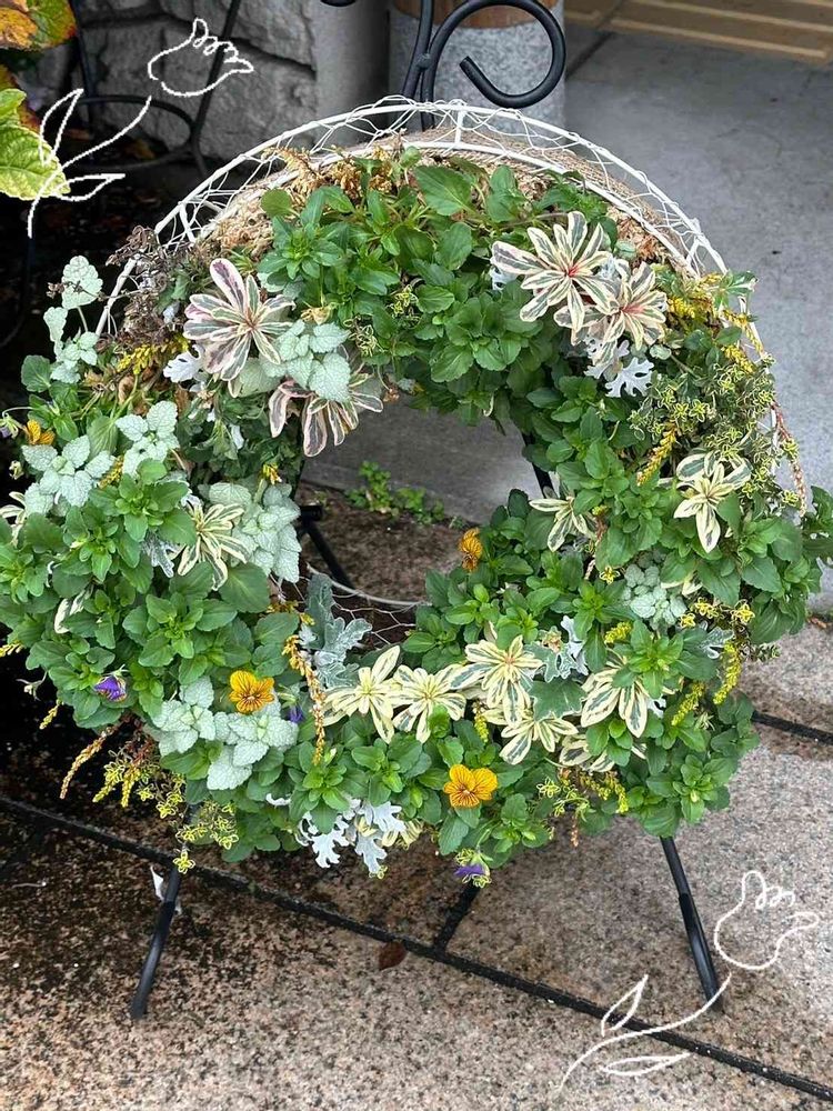 滋賀県の道の駅に飾ってありました。💚グリーン基調でシンプルなリース寄せ植えもいいですね💚