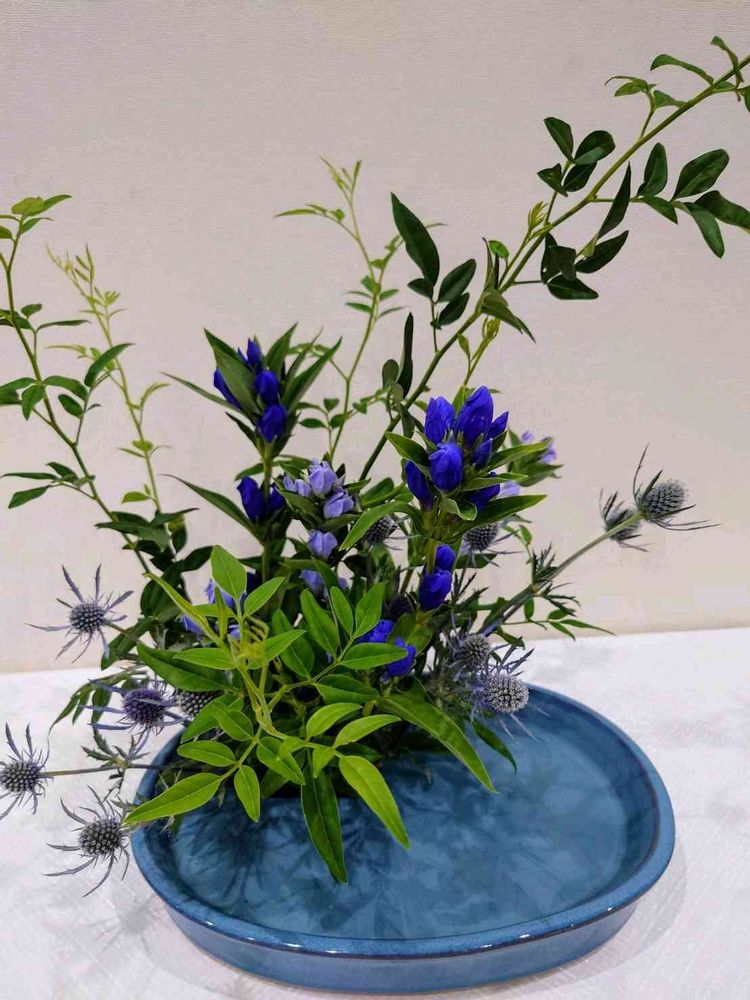 生け花展のリンドウとエリンジウムの花が美しいです💜🌿