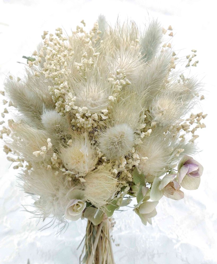 ナチュラルベージュの絶滅危惧種二類のオキナグサの種子と淡いモスグリーンのラグラスでモコモコのミニスワッグを作りましたー💐