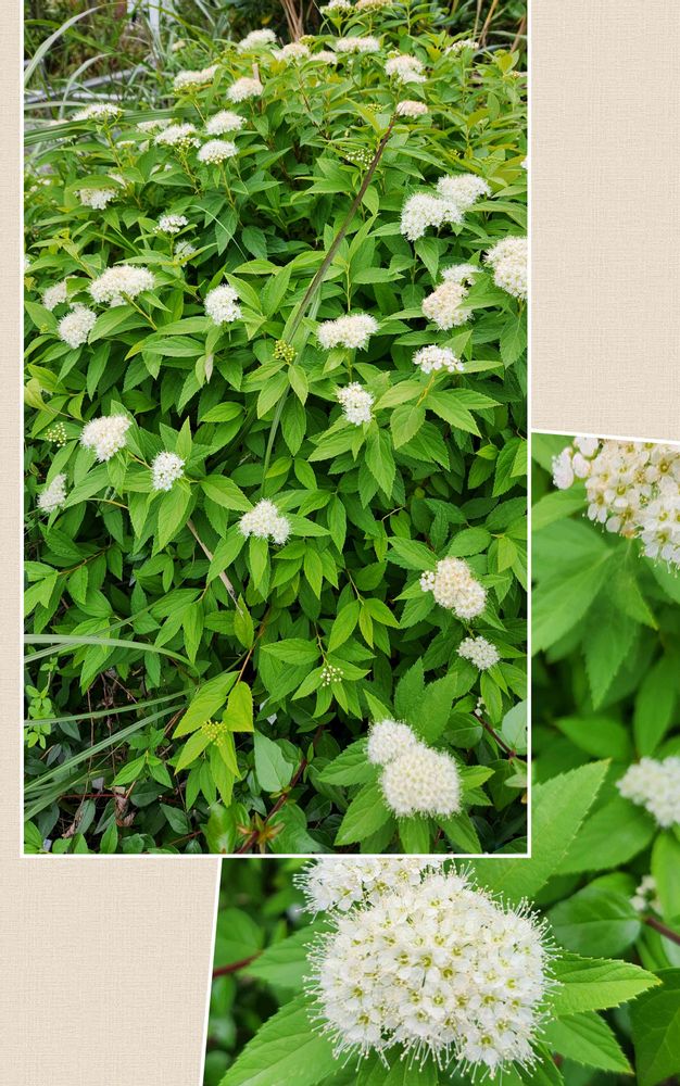 スーパーの駐車場の周囲に、白いシモツケの花があちこちに満開です。シモツケって今頃も咲くのですね。