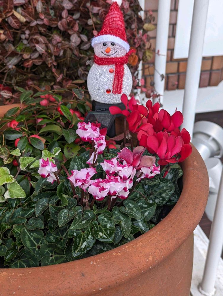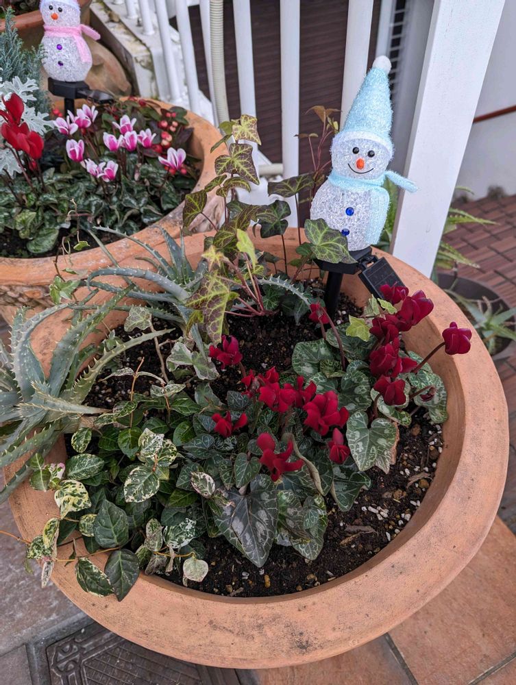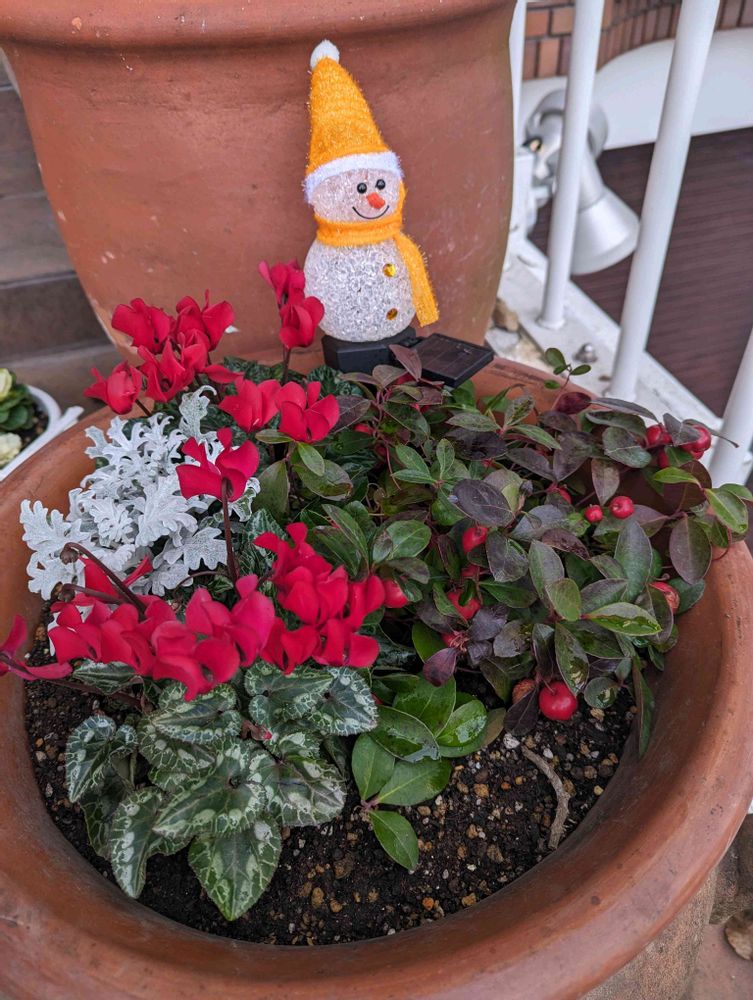 ①〜④レストラン前に飾られていた❤️シクラメン❤️💚チェッカーベリー💚🤍シロタエギク🤍の寄植え、雪だるま⛄も可愛らしいです🤗💕