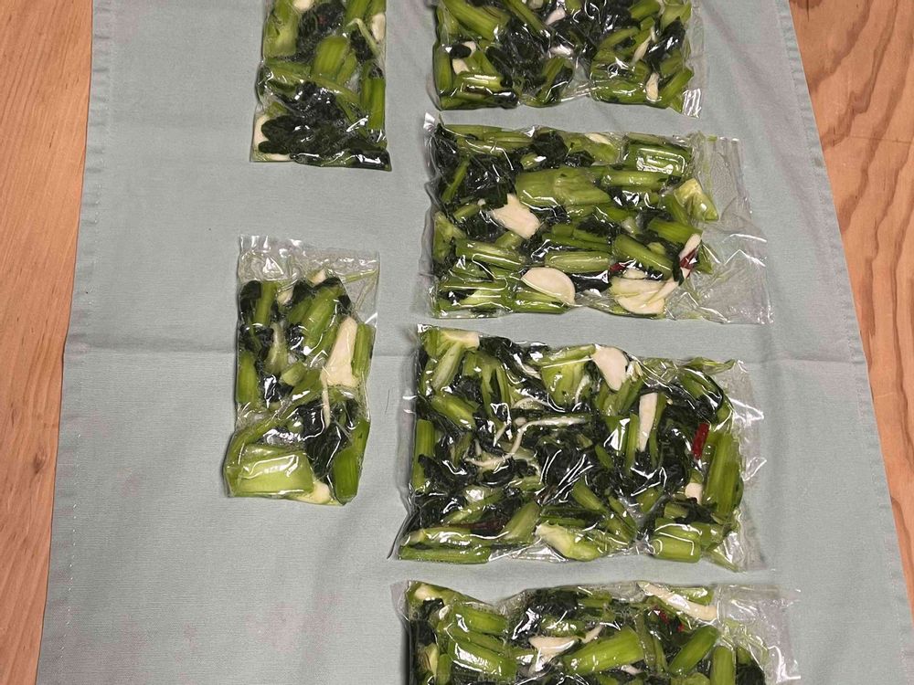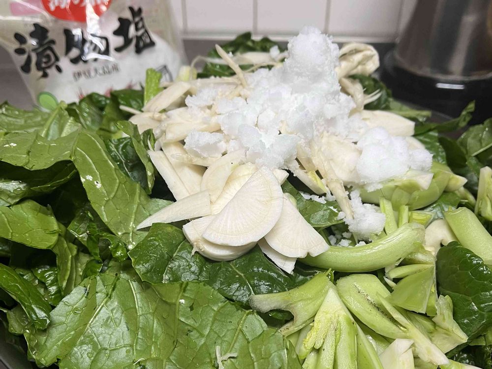 冷凍庫で一晩凍らせてから翌朝自然解凍して直ぐに美味しい野沢菜漬け風の小松菜漬です💕