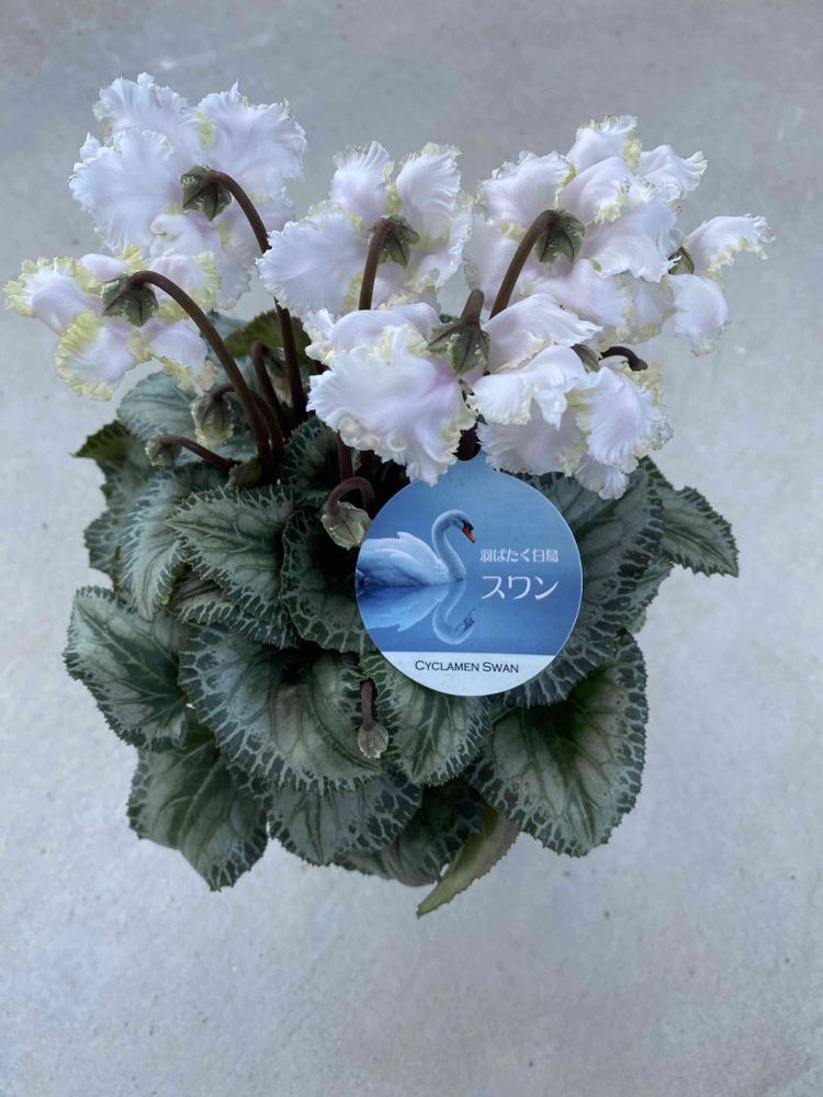 今年最初の購入は、初の白いシクラメン。スワン🦢綺麗〜