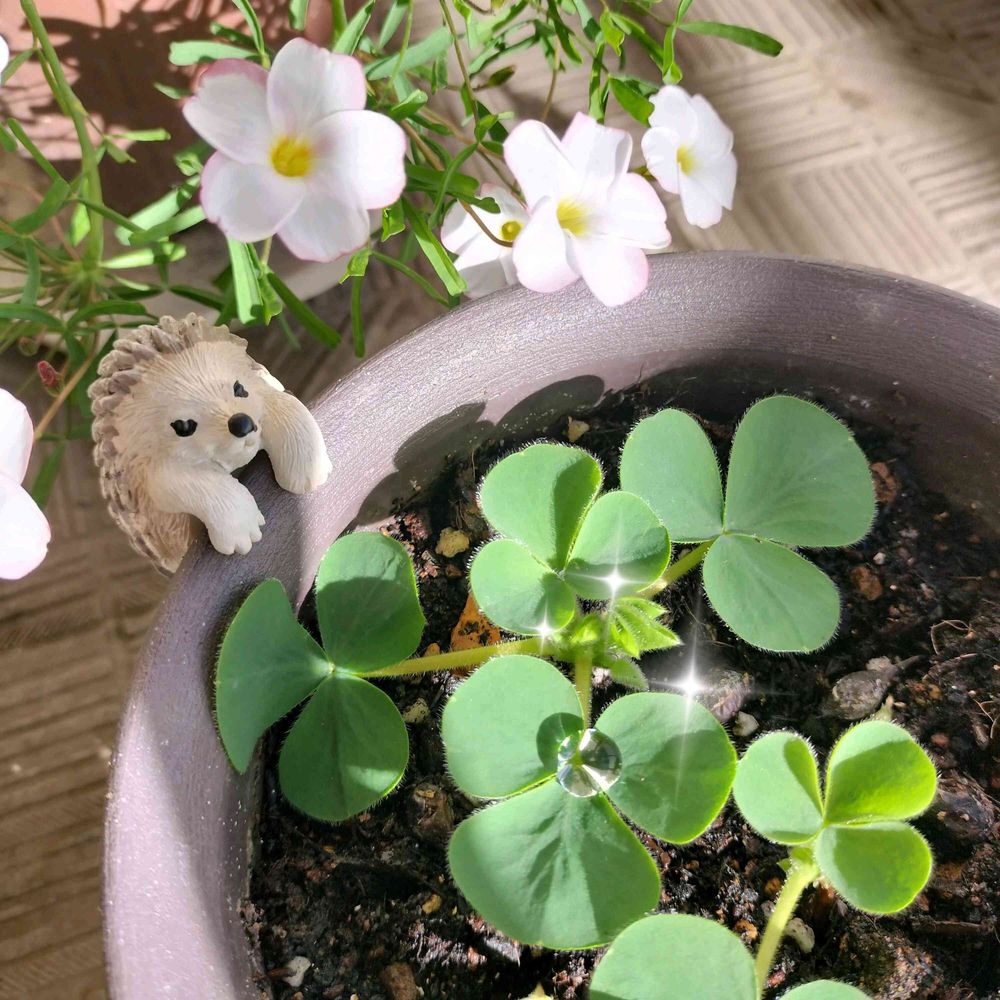 4枚目〜オキザリス見守り隊の🦔君が偶然水遣りの表面張力で🍀に絶妙に出来た💧の宝石💎を見付けたよ~✨